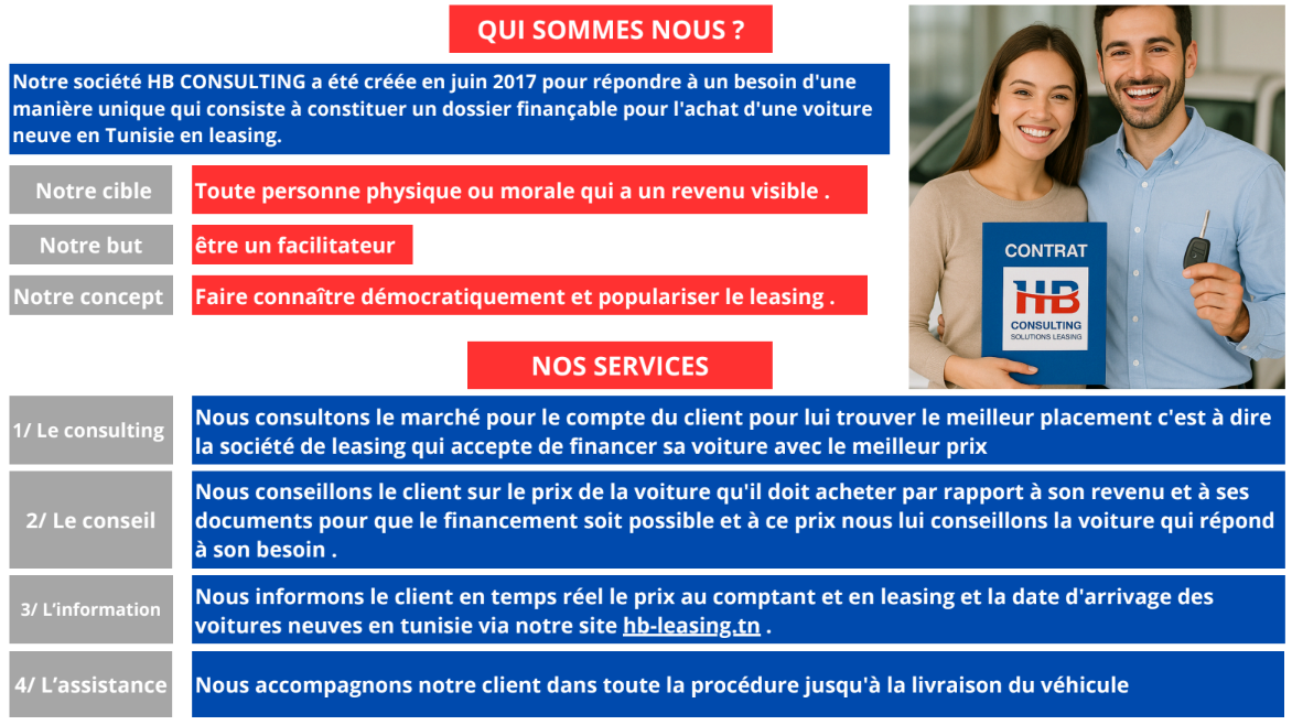 Où que vous soyez en Tunisie, HB vous assiste pour la constitution d’un dossier de leasing, que ce soit par courrier ou par une visite dans nos bureaux. Que vous soyez salarié, retraité, patenté ou rentier immobilier, HB vous trouve une solution de financement leasing. Pour les résidents tunisiens à l’étranger, il est nécessaire de posséder un compte bancaire en Tunisie et d’être présent physiquement, ou bien vous pouvez initier le dossier de leasing au nom d’une autre personne résidante en Tunisie.